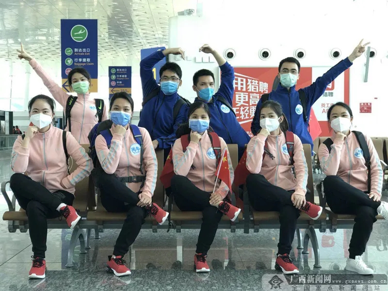 今天11時30分,廣西支援湖北第一批醫(yī)療隊153人出發(fā)去武漢天河機場,乘坐14時的飛機返程。