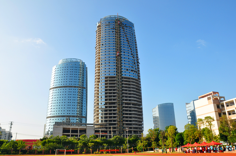 《建設中的綠港國際中心》(榮鑫公司 趙志業(yè))圖片說明:綠港國際中心正在做外墻玻璃裝飾施工,在陽光的照耀下美麗而雄偉。球場上的運動員意氣風發(fā)。預示著綠港集團充滿活力。