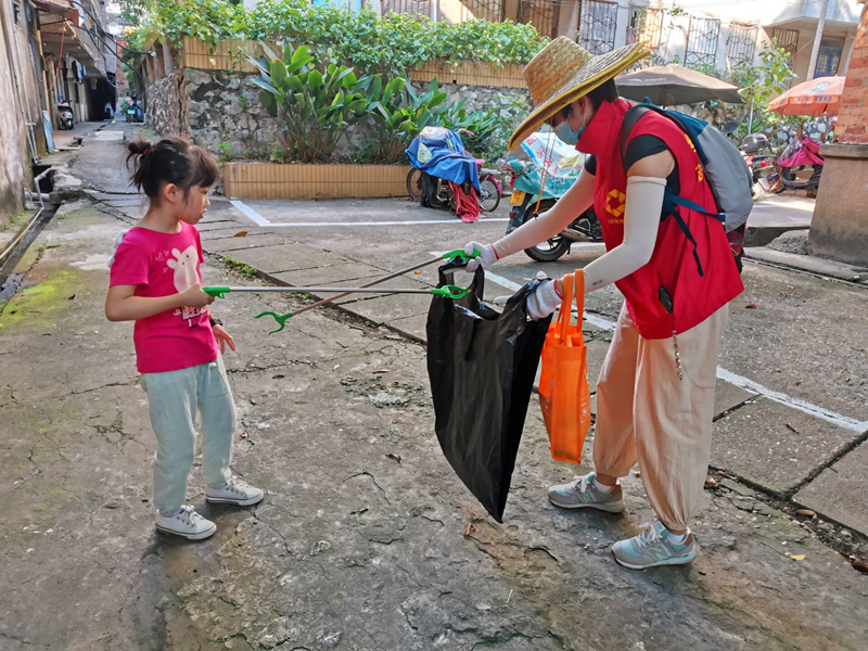 雖然他們年紀(jì)小,但是創(chuàng)城志愿服務(wù)的熱情卻十分高昂。李悅歌小朋友早上一到工作地點(diǎn)就迫不及待地去找工具,一直問媽媽我們能做什么,我們要做什么,甚至連早餐都顧不上吃。一個(gè)上午她跟隨著媽媽,對槎路社區(qū)的小廣場進(jìn)行了打掃,清理了球場維修時(shí)打碎的玻璃渣子和積水區(qū)。隨后,她又跟隨著媽媽進(jìn)入到小區(qū)里,撿拾居民丟棄在外面的垃圾。一開始由于個(gè)子比較小,拿的夾子有點(diǎn)長,她控制不好,怎么夾都夾不住那個(gè)小小的煙頭,經(jīng)過她反復(fù)實(shí)驗(yàn)終于掌握了力道,知道夾子靠下面的部分比較好控制,容易把物品夾起來。在掌握了竅門以后,她開啟了瘋狂“尋寶”的過程。她就像發(fā)現(xiàn)寶藏一樣去發(fā)現(xiàn)丟棄在樹葉、花圃帶、水溝里面的煙頭,甚至比志愿者姐姐和阿姨們發(fā)現(xiàn)的還快,每當(dāng)她撿拾到煙頭,她都特別的興奮。志愿者阿姨們也從草叢里將垃圾撿拾出來,讓她負(fù)責(zé)把煙頭和垃圾放到黑色的垃圾袋里。