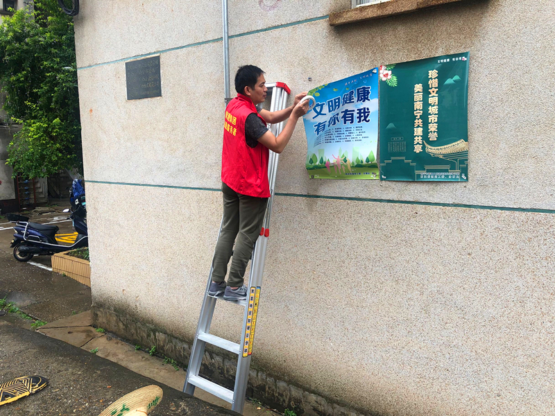 志愿者在張貼創(chuàng)城宣傳報(曾慧玲)